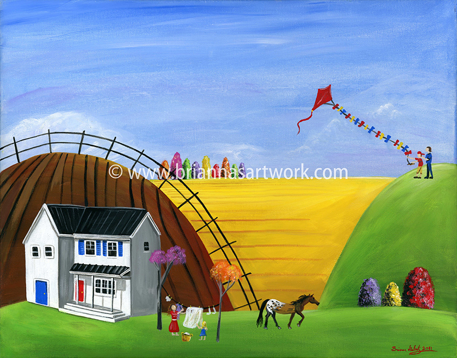 The Hilly SeriesBrianna creates folk art that is fun and whimsical, with a little bit of funk. Sweet characters inhabit a charming hilly land. The delightful paintings are chock full of a winsome collection of houses, hills, hot air balloons, scarecrows, horses, dogs, cows and cats, kites, kids, and snowmen. Her use of vibrant colours creates an enchanting world that draws you in. Each scene is beautiful and moving; it is the warmth you feel that will cast a familiar smile on your face. VIEW |
