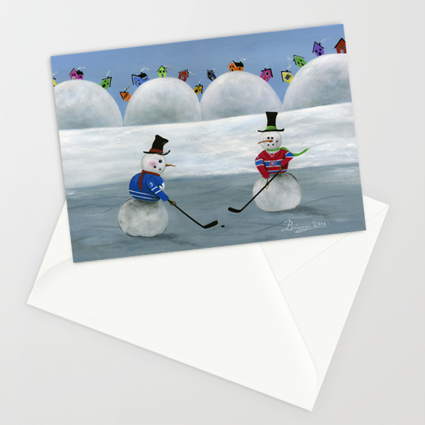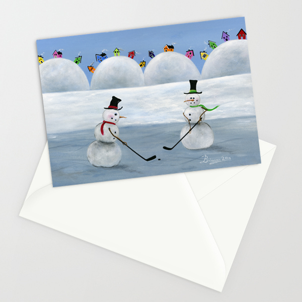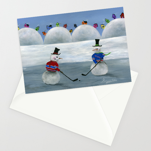 Two snowmen playing outdoor pond hockey fight for the hockey puck. A whimsical scene with colorful houses perched on the hills overlooking the lake.